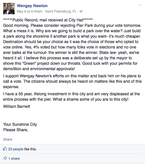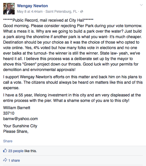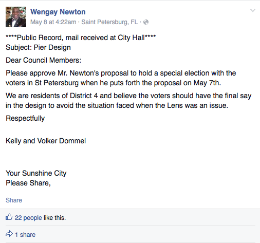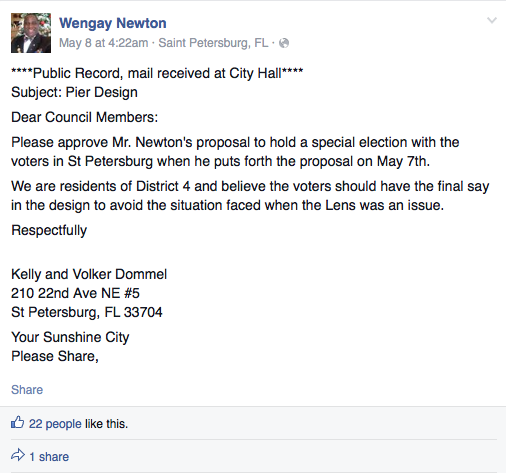 In the first post, Newton includes the name and address of two St. Pete residents. The email he received asks the rest of council to “approve Mr. Newton’s proposal to hold a special election with the voters in St. Petersburg.
