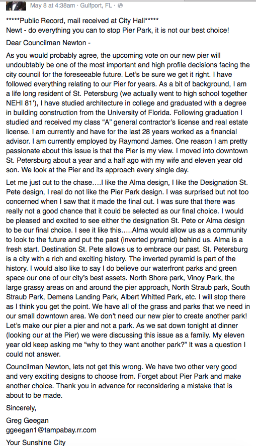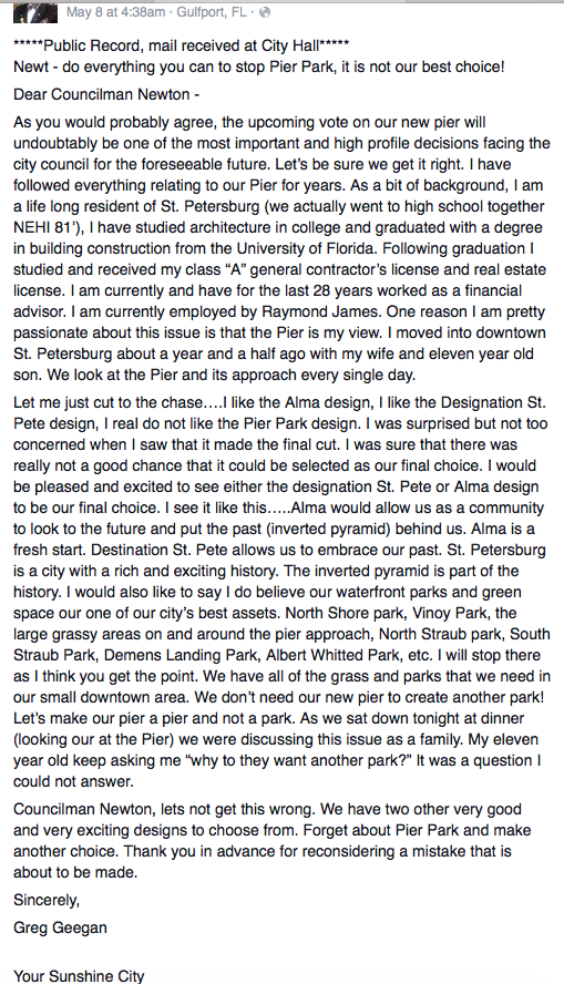The longest of the four emails came from Greg Geegan. He asks Newton to “do everything you can to stop Pier Park.” Geegan’s email is not a blatant endorsement for Destination St. Pete – he indicated he’d also be happy with Alma – but it was most certainly railing against Pier Park. The email did not contain his home address, but did include his email address.