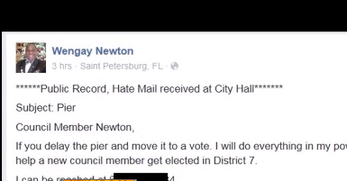 Last week, St. Pete City Council member Wengay Newton came under fire for posting a constituent’s personal information on Facebook, including his name, address, phone number and email address.