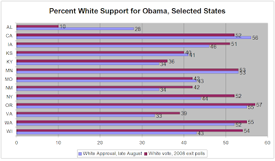 But the point I’m making is that Obama’s white voter “problem” is a bit overstated. Yes, he seems to have dropped a bit in Virginia and Wisconsin, two states he won by a somewhat slim and very comfortable margin, respectively. And maybe he had better pay attention to New Mexico. But his numbers are actually up in some states, and overall they track pretty closely in all 13 states except Alabama–where his approval far exceeds his white vote share 10 months ago.