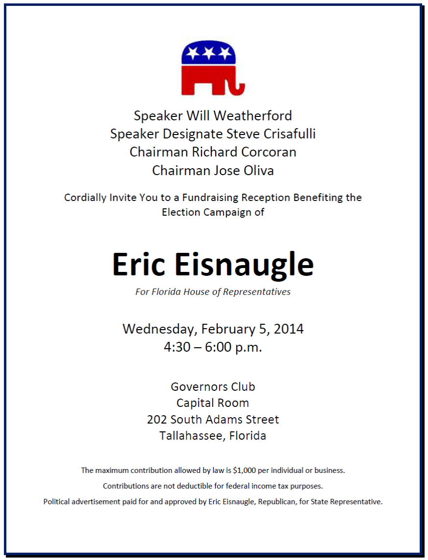 Weatherford, as well as Speaker Designate Steve Crisafulli and Speakers-to-be Richard Corcoran and Hose Oliva are headlining a reception for Eisnaugle in Tallahassee on Wednesday, February 5. The event will take place in the Capital Room of the Governors Club.