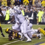 13. Barkley ran for 56 yards against Indiana and still was the star of the show with a 98-yard kickoff return for a touchdown, a touchdown pass and a silly one-handed catch .