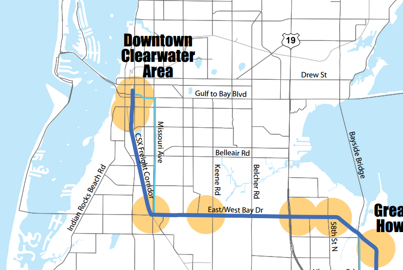 The “Design Alternative” for the Clearwater section of Greenlight Pinellas has the light rail line running east/west for approximately half of a mile along Gulf to Bay Boulevard and north/south for approximately three miles along Missouri Avenue, one of the busiest roads in north Pinellas County.