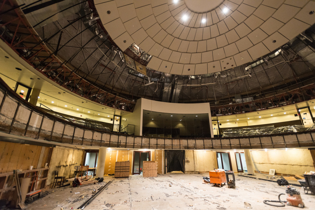 The carpeting now has been torn up, the old paneling ripped out, acoustic tiles and lights taken down. Workers now are dismantling the metal framing underneath in preparation for a new dome, modeled after one in the Old Capitol. Scaffolding will soon be erected so they can reach the ceiling.