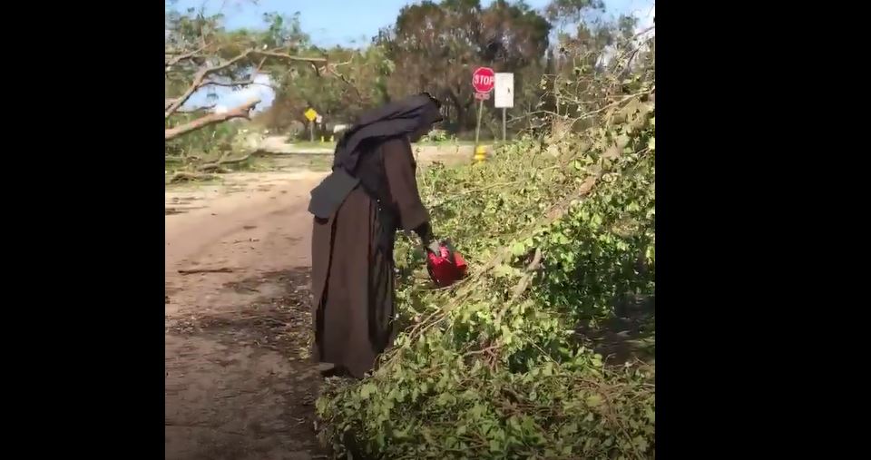 A Florida nun is pitching in on the cleanup efforts following Hurricane Irma by taking a chain saw to downed trees while dressed in her full habit.